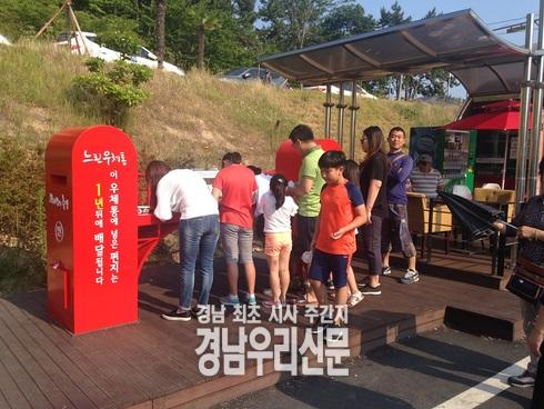 느린우체통은 콰이강의 다리 모양을 본 따 우체통 두 개를 다리가 연결하는 모양인데, 각각 한 달 느린 우체통·1년 느린 우체통으로 엽서를 나눠받는다. 7월 10일 기준 한 달 느린 우체통은 2만6464통, 1년 느린 우체통은 2만3842통으로 합계 5만306통을 기록했다.