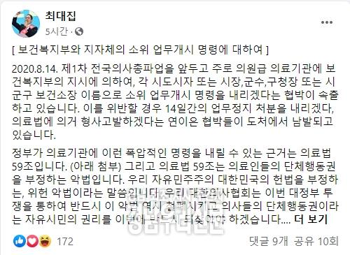 [경남우리신문]최대집 대한의사협회 회장이 12일 페이스북을 통해 [보건복지부와 지자체의 소위 업무개시 명령에 대하여]라는 제목으로 장문의 글을 게재했다.