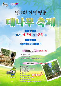 [경남우리신문]거제시 맹종죽 자원을 활용한 향토산업 활성화와 지역경제 활성화를 위해 「제11회 거제 맹종죽 대나무 축제」를 오는 4월 24일부터 26일까지 3일간 거제맹종죽테마파크 일원에서 개최한다.   ▲거제맹종죽영농조합법인, 제11회 거제 맹종죽 대나무 축제 개최     ©경남우리신문 편집국 거제맹종죽영농조합법인이 주최·주관하는 이번 축제는 지역 ...