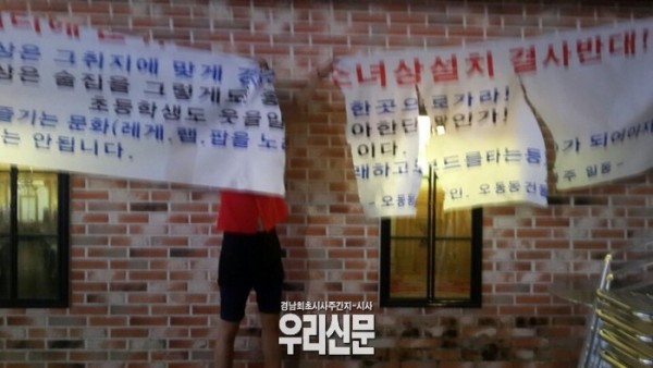 강 대표는 "지난 8월 11일 새벽 2시경 6~7명 정도의 성인 남성들이 몰려왔고 그중 한명이 칼을 들고 현수막을 훼손하는 사태가 발생하였으며 그들은 박수를 치며 “술집거리에 소녀상이 있으면 더 술맛이 있지 뭐가 나쁘노” “반대하는 것들은 다 친일파다” 라며 폭언과 욕설을 퍼부었으며 이를 제지하려던 여성 상인에게 그들 중 한명이 “이년아 니는 한달 안에 쥐도 새도 모르게 죽일꺼다” 라고 협박까지 했다"며"이젠 모든걸 떠나 반대하면 죽을 수 도 있겠구나란 공포감마저 든다. ‘위안부소녀상’건립이 강행되면서 오동동은 완전 아수라장이 되었다"고 하소연 했다.