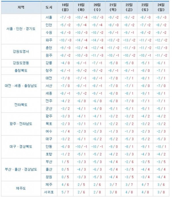 전국 영하권 날씨 내일 경남전역 영하권으로 추워져 18~24일 전국이 영하 5℃이하로 떨어져 ~ 기사입력 2016-01-18 18:22 최종편집 경남우리신문 작성자 황미현 기자 본문 0 기상청은 18일 오전 대설 특보가 발효되고, 내일 아침 서울 최저기온이 영하 14℃까지 내려가는 등 피해가 우려되고 대설특보가 발효된 충남, 전남․북 지역을 중심으로 내일(19일)까지 최고 20cm의 큰 눈이 예상된다고 밝혔다. 1월 3째주(1.18~24) 전국이 영하 5℃이하로 떨어져 수도계량기 등 동파위험이 높아져 각별한 주의를 당부했다.