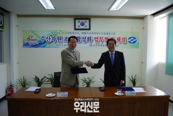 경상남도수산자원연구소(소장 박경대)는 3월 21일 오전 연구소 회의실에서 수산자원 조성 활성화 등을 위하여 대형기선저인망수산업협동조합(조합장 정연송)과 업무협약을 체결했다고 밝혔다.