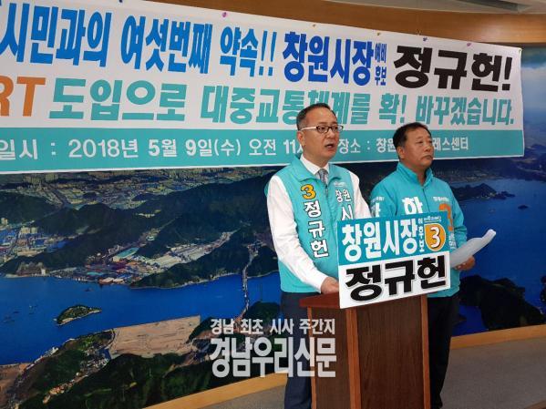 바른미래당 정규헌 창원시장 후보가 9일 오전 창원시청 프레스센터에서 기자회견을 열고 6번째 공약인 “GRT, BRT 도입으로 대중교통체계를 확 바꾸겠다”고 공약했다.