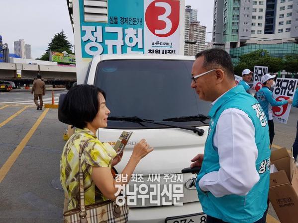 바른미래당 기호3번 정규헌 후보는 이번 선거가 시작되는 첫날 ‘마산홈플러스’ 앞 첫 유세를 가졌다.많은 지지자들이 지켜보는 가운데 정 후보는 ‘마산시민 여러분께 인사드립니다’라는 멘트로 시작했다.