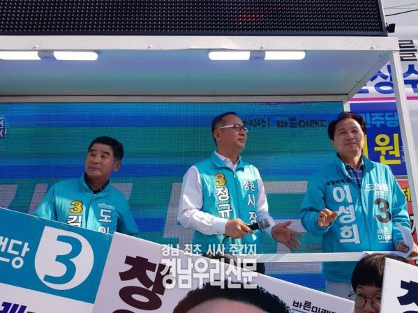 정규헌 후보는 이날 유세차에 올라 본인의 로고송 가사를 인용하며 “창원의 준비된 시장, 실물경제 전문가 바른미래당 기호3번 정규헌이 위기의 창원 경제 살리고 창원을 바꾸겠다. 침체된 마산경제, 정치인들이 망쳐놓은 마산, 위기의 마산합포와 회원구를 재건하기 위해서 일 할 사람 정규헌을 뽑아달라”고 지지를 호소했다.
