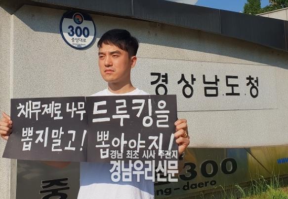 지난 25일, 오후 1시경 경남도청 입구에서 ‘드루킹에 대한 진상규명을 밝혀라’, “채무제로 나무 뽑지 말고 드루킹을 뽑아라‘ 라며 푹푹 찌는 무더위 속에서 피켓을 든 두 청년이 경남도청을 향해 시위하는 모습을 보며 뜨거운 도로를 달리는 많은 도민들의 눈길을 끌었다.