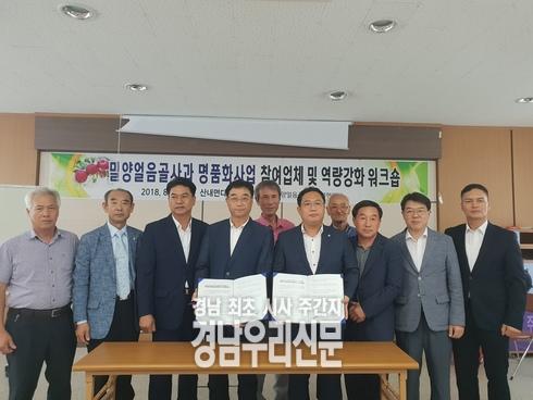 산내면 다목적센터에서 개최된 이번 협약은 6차산업 지역단위 네트워크 구축지원사업의 일환으로 ㈜영남알프스얼음골케이블카 등 10개 단체 200여명 회원이 참여한 ‘얼음골사과 명품화 브랜드 육성사업 역량강화 워크숍’과 함께 진행되어 참석한 이들로부터 얼음골사과 판로 확장과 농촌체험관광 활성화 요구에 대한 폭넓은 공감을 이끌어냈다.
