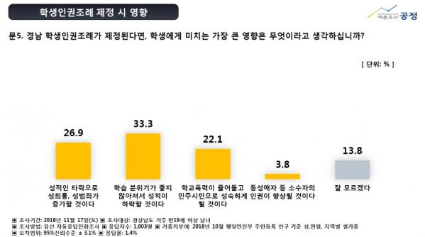 “경남도민 33.3%, 학생인권조례 제정으로 면학분위기가 좋지 않아 성적하락할 것”
