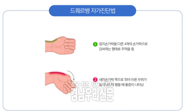 드퀘르뱅 증후군은 손목의 내측과 중앙, 외측에 있는 여러 개의 힘줄을 감싸고 있는 막에 생긴 염증을 말한다. 손목건초염, 손목협착성 건막염으로도 불린다. 엄지손가락의 염증으로 인해 뻐근함과 통증이 주된 증상이다. 이와 비슷한 손목터널 증후군은 손목의 통증과 손가락 저림이 주 증상으로 차이점이 있다.
