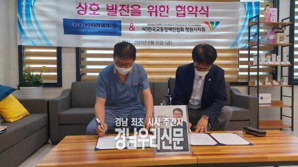 [경남우리신문]굿네스의원(원장 정동석)과 (사)한국교통장애인협회 창원시지회(회장 홍민식)이 지난 6월 25일 오후 굿네스의원 본점에서 상호 우호증진과 사회공헌 활동의 나눔 봉사이념에 함께하고 지역사회 의 신뢰를 바탕으로 상호발전을 위한 협약서를 체결했다.