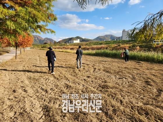 [경남우리신문]밀양시 삼랑진읍 행정복지센터(읍장 전장표)에서는 2023년 삼랑진 딸기시배지축제 예정지로 활용할 미전천에코파크에 지역주민들이 유채씨 60kg을 파종했다고 2일 밝혔다.