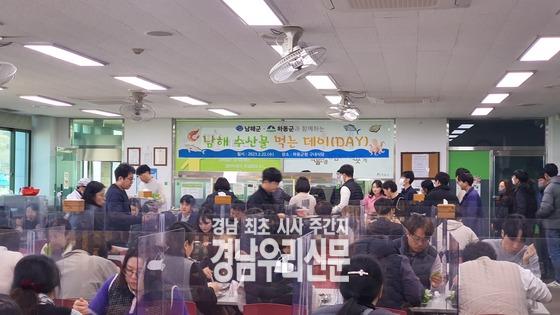 [경남우리신문]남해군은 22일 하동군청 구내식당에서 남해 우수 수산물 홍보를 위해 남해군 생멸치 키트를 활용 한 ‘남해 수산물 먹는 데이(DAY)’ 행사를 진행했다.
