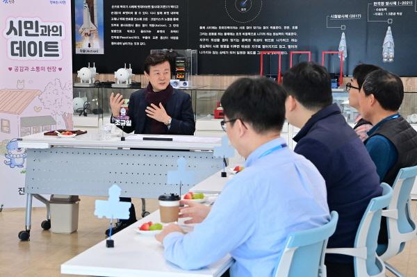 [경남우리신문]조규일 진주시장은 26일 한국산업기술시험원(KTL) 우주부품시험센터 2층 대회의실에서 진주시 초소형위성인 ‘JINJUSat-1B(진주샛 원 비)’ 개발사업 관계자 8명과 2월 시민과의 데이트 시간을 가졌다.